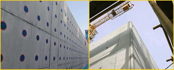 红蓝标识打造“秩序之美”,破解外墙防水难题。地下室外墙防水是工程施工重点,直接关系居民居住质量。项目部采用三段式止水螺杆替代传统通丝螺杆,中间段留置墙内形成止水屏障,两端锥形头可拆除,形成规整锥形坑。项目部创新采用红蓝圆形防水涂料封堵工艺,经螺杆眼清理、砂浆封堵、分层精准涂刷等工序,以螺杆眼为圆心交替涂刷红、蓝涂料,形成整齐矩阵。原本普通的螺杆孔洞变身外墙“纽扣”阵列,既展现工业秩序之美,又实现防水质量可视化管控,从源头杜绝了渗漏隐患。